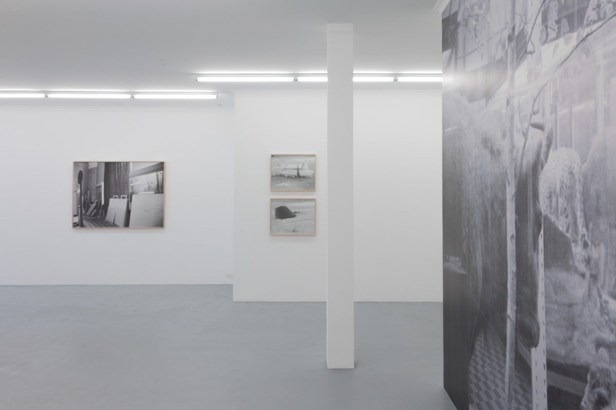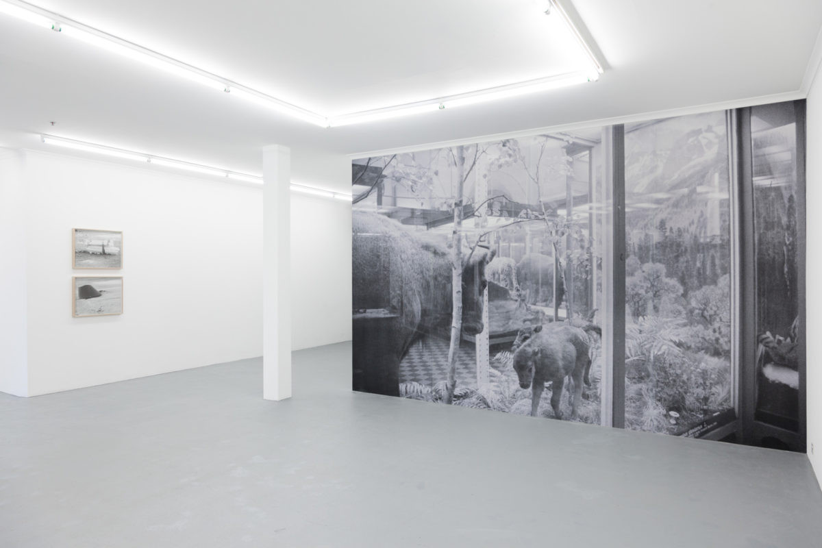 Museum – an image exhibited as photomural wallpaper from inside a natural history museum – is a reference to Georges Cuvier’s 1795 reconstruction of a mammoth to demonstrate his new theory of fossils transforming them from sheer curiosities into traces of life that has been extinct and proof of catastrophic transformations in the history of the earth. This work is life size and depicts a complex web of layers and reflections – glass, mirrors and murals of mountain vistas – that house preserved species or hybrids. The photographic process renders time still echoing the frozen diorama in an ambiguous montage.