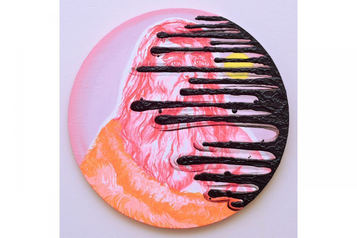 Ohnesorge’s large scale figurative sculpture low life presents a character transfigured by material, a hyper-real, candy-pop vision of a wild man in the landscape, the rectangular shape of Kelly’s mask taking over the head, Buckley’s long unkempt beard spilling over the torso. He seems perplexed, scratching his head, vulnerable to the landscape and bound to mortality, abstract paint drips linking the figure and the skull. The small sculpture Invasion mirrors the formal qualities of the painting Invasion (The Loss of Liberty), the glass bell jar a stand-in for Bennelong’s profile again invaded by the arriving tall ship, which towers menacingly over the landscape. These sculptures are experiments in language, reliant on our physical, tactile and cultural associations to colour and object. Whilst at work on a sculpture, Ohnesorge acts as a dilettante anthropologist fine-tuning the organisation of human social and cultural relations, bringing objects into dialogue and freeze-framing the conversation at a sweet spot of rich evocation.