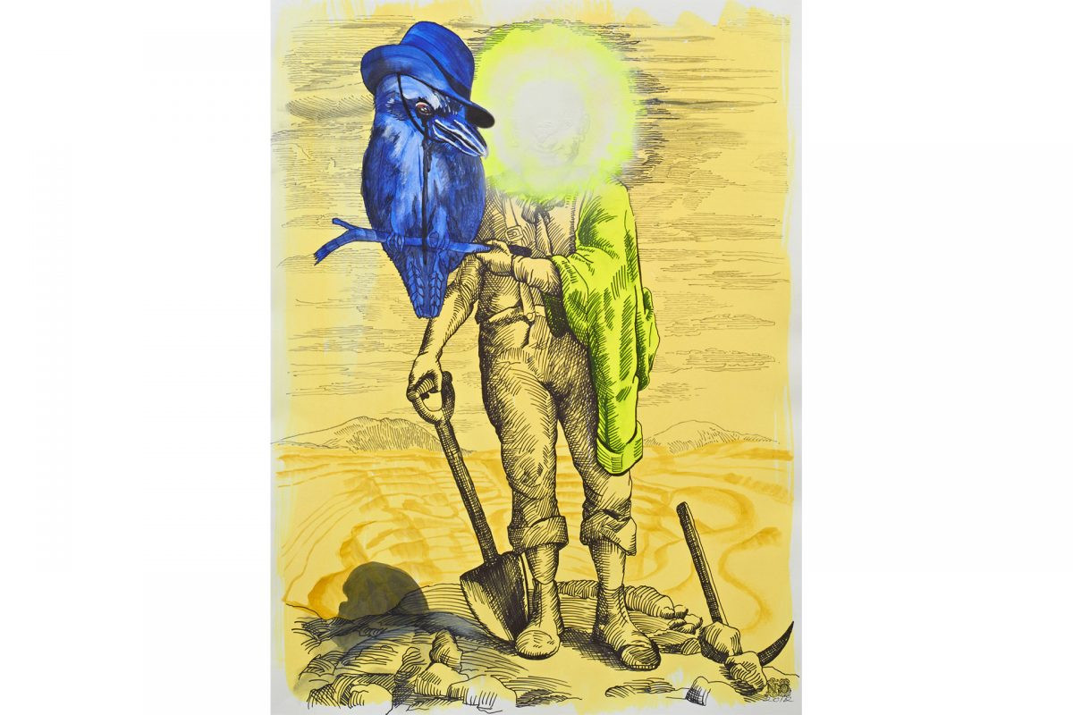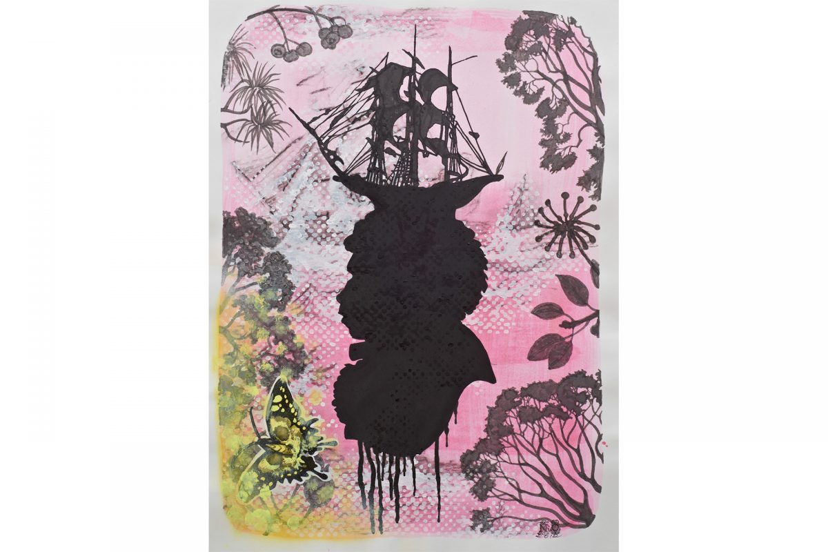 The native flora and fauna in this series are subject to a state of shifting colour. A brown snake is painted bright green in The Naturalisation of William Buckley, the artist’s colour switching unapparent to the viewer, acting as a silent totem for Buckley’s own new skin. The kookaburra in Australian Mining sits ablaze in bright blue, beside the obscured head of the golden mining figure, the identity of both bird and figure effectively muddied. The obscured head central to the image is an open wound in the landscape. The ornamental butterfly in Trophy (Bennelong), historically collected, catalogued and cased behind glass, forms a counterpart to Bennelong’s own dislocation.