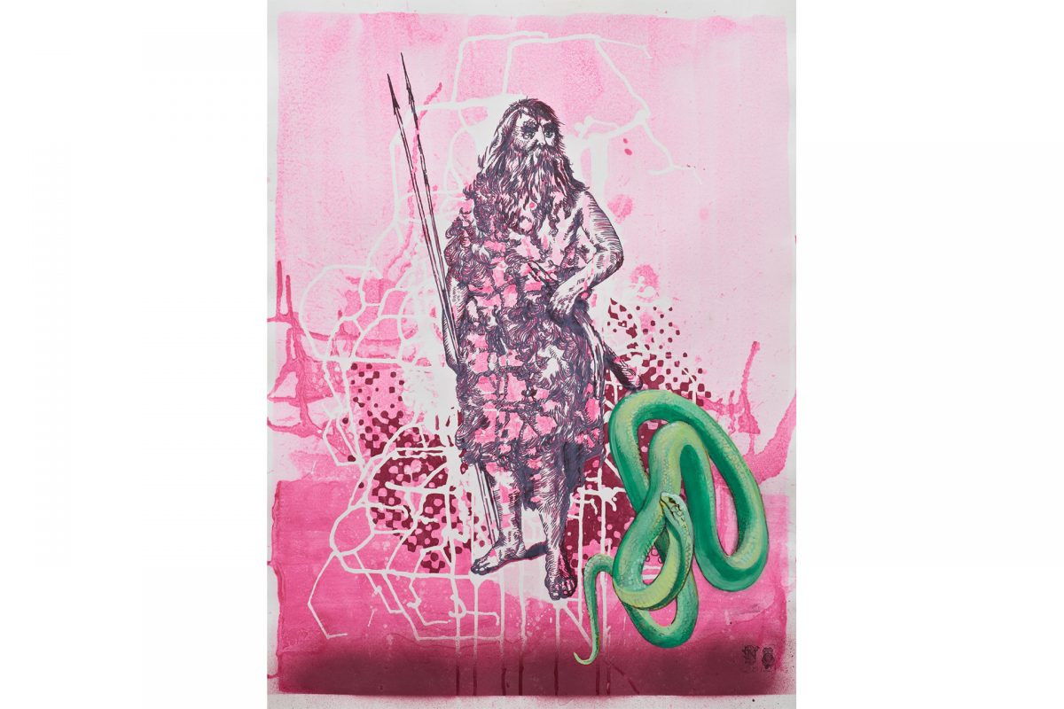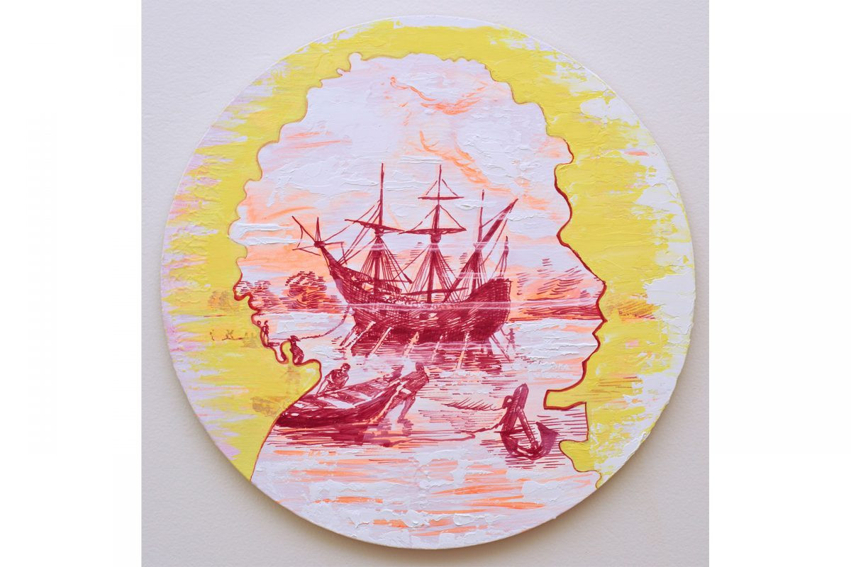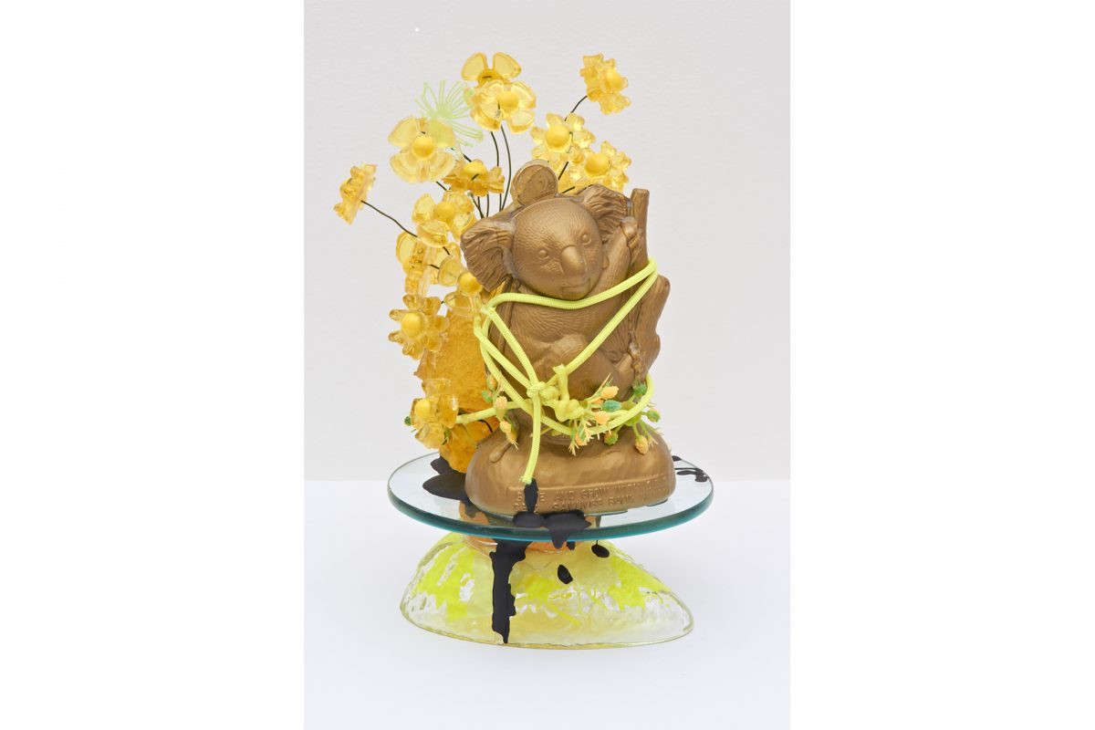 The stories of such individuals, torn between worlds are always conundrums of conjecture, observed by outside voices and seldom well documented from the inside. Ohnesorge’s paintings mimic this puzzle, with a discordant visual language oscillating between the familiar and the strange, grounded in intuition and a logic of surprising interventions. Her colour palette is unapologetically bold, rich in neon and anti naturalistic hues, a palpable opposition to the picturesque. Her drawings are layered with myriad textures, recalling the detail of old engravings in Australian Mining, and creating a hallucinatory dot screen matrix in Trophy (Bennelong), disrupting the appearance of the tall ships. Her sculptures are small universes of bilingual conversations merging loaded materials and found objects, both from nature and the manufactured treasure chest of our contemporary disposable culture. Ohnesorge seems drawn to oddness and works intuitively, combining objects that are often kitsch or grotesque in isolation, yet the artist seems to normalise this strangeness, bringing harmony, humour and vitality to create provocative visages.