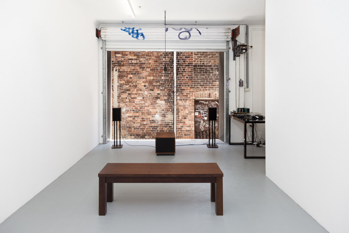 The way you stand in front of HORSES, or move around the AUTOHARP – how you inhabit the space – is important when turning to Bruniges’ final work, WALL (2016). The drone emanating from the speakers in front of the open roller door is live: it is active and generating from the present moment, as the work picks up the ambient sound of the environment, reconfiguring it and returning it back outward. For Kundera, ‘everyone seems to live inside an enormous resonating seashell where every whispered word reverberates, swells, into multiple and unending echoes.’5 Bruniges repurposes these echoes into a different kind of seashell, as the sounds that you or those around you make, even the singing tones of the autoharp, feed into the creation of the drone, giving immediacy to its stasis/flux binary. But it is the slowness, and how you interact with it, which necessitates an engagement with this particular paradox. And, as the name suggests, WALL plays with the architecture of sound: when you sit on the bench you not only hear a wall of sound, but are also facing the brick wall beyond it, even as the drone emanating from the speakers creates an invisible barrier between you and the bricks. It’s not one wall but many. Mikhail Bakhtin, in developing his theory of the novel form, writes about chronotopes – a word that mashes both time and space together. For Bahktin, a chronotope describes a narrative event where ‘time, as it were, thickens, takes on flesh, becomes artistically visible; likewise space becomes charged and responsive.’6 In this moment, ‘the knots of narrative are tied and untied’, and coherent meaning begins to unravel.7 You can think of Bruniges’ drones as chronotopes – decelerated arrhythmia at the exact point where time thickens and becomes more perceptible, just as the resonant nature of space is brought to the fore.
