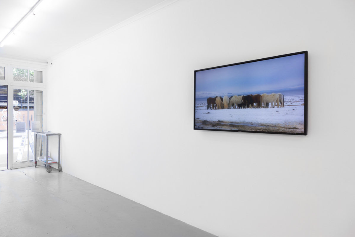 There’s a similar feeling of suspension as you stand in front of HORSES (2015), with a cluster of animals arranged almost symmetrically in the centre of the frame. Many of the horses have their heads down; a few are turned towards you, coffee crème manes set against a snowy background. The landscape, albeit beautiful in its stark crispness, becomes immaterial, rather your focus remains fixed on the bodies of the horses. Is it a static image you’re looking at? Does it change or did you imagine that lifted hoof? You look once, you turn away, you look back again; the scene will be different. You pause, hesitate – give it time – and you will begin to see that it is near impossible to discern where each frame starts and ends, where the next begins, but yes, it’s moving. Bodies merge, separate, and merge again, leaving blurry impressions and shifting blotchy shapes. And then again, like AUTOHARP, there will be moments where it may not appear to move at all. HORSES is a visual drone, both making and moving, humming along with the gentle arc of a horse turning its head. The effect is the obverse of Eadward Muybridge’s well-known early experiments in filming a horse: Bruniges is less concerned with a gallop than with a halt, a halt that is prolonged, extended and lengthened.3 ‘There is a secret bond between slowness and memory,’ writes Milan Kundera, ‘between speed and forgetting’, and it is in slowness that our sensory perception expands rather than shrinks.4