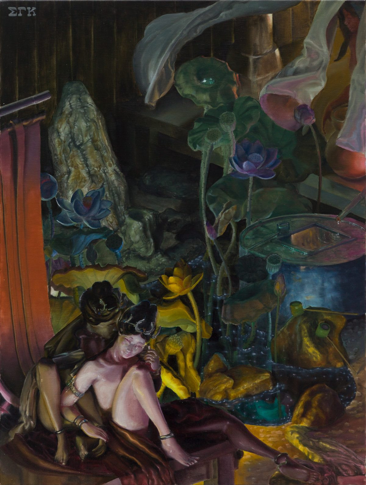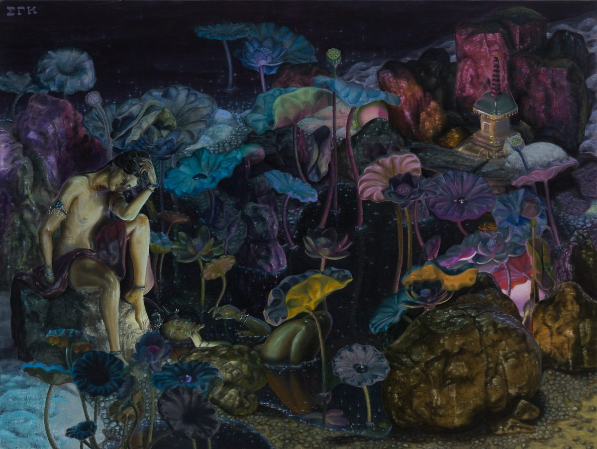 In constructing the virtual spaces of the paintings, my selection of further motifs – gardens with lotus plants, rocks and water, passionate deities, and suggestions of palatial architecture – came from a meaningful relation I sensed with the aesthetics of the aristocratic Buddhism and Daoism of the Heian period of classical Japan (roughly 9th – 12th centuries). In these paintings I have attempted to conjure up an atmosphere of lotus esotericism, inspired by the art of that epoch, whose nobles sought to realise life as a dream-like world of change, an interpenetrating mystical unity of opposites. Through my encountering it during my travels to the ancient capital it was my impression that its flamboyant forms embody an attitude that we are co-conscious creators in this drama of life, called upon to bring heaven to earth by being seekers of it in this very body, penetrating into the depths of nature and a humanity that is constantly evolving towards the superhuman.