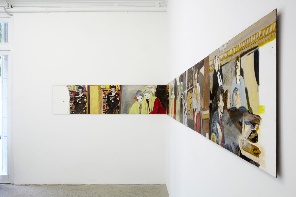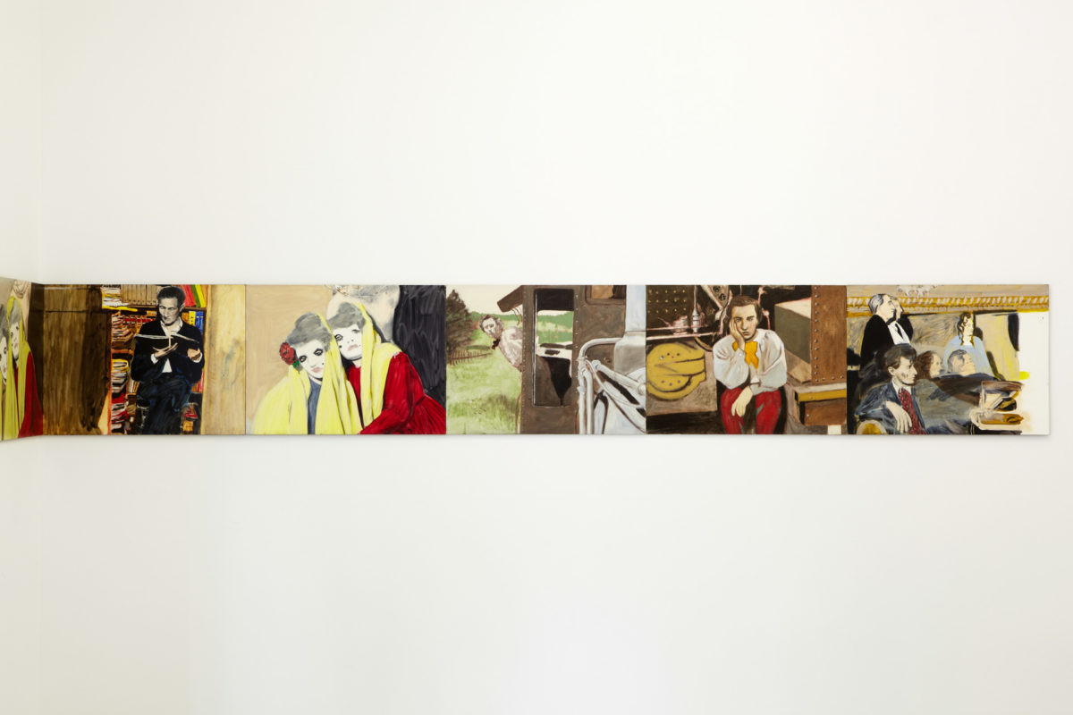 Smith’s emotive paintings draw us into her world of filmic allegories and desire but, importantly, it’s the artist’s powerful brushwork and unwavering exploration of the same image that firmly casts our gaze back onto the painted surface. Broad sweeping strokes, moments of energetic mark making juxtaposed with quieter washes and lone drips. Charged by a process of repetition that, unlike film, refuses us multiple vantage points, and makes the audience self-conscious of their own relationship to the painting and expectations as a viewer. We grapple with the nature of the serial as we can no longer locate the original, distorting our perception of the artwork or, as Smith recalls, ‘it’s like when a word is repeated it begins to sound increasingly strange.’ Similarly, the artist’s copies always carry a slight visual stutter – a shift in colour, an unfinished scene, an additional figure – drawing us back to the painting process and inherent construction implicit in all image making. Like Smith, we begin a game of comparison, looking for variations that will forge that ‘original’ space again or catch what exists in between, that which is lost. Similar to acts of human memory in which we play sequences of events over in our minds so as not to lose sight of them, but subsequently cloaking them with layers of memories. And like every thought, with each coat of paint Smith moves further from the original and confirms this loss, this regret, the time passing, as to picture something is to inevitably imply it is no longer there.