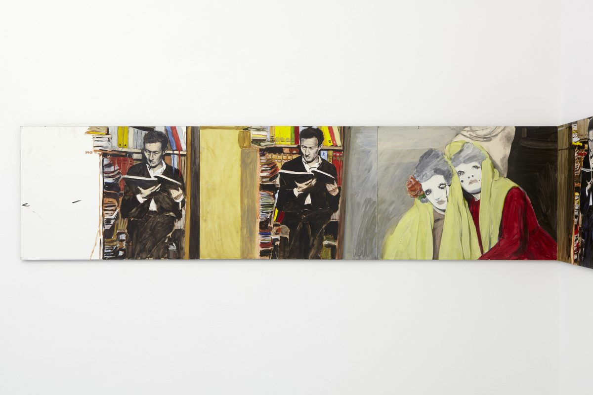 In Memories for Tomorrow we are guided past an older, more contemplative Barrault reading in front of a bookcase, and later confronted by his piercing gaze recalling the regret of lost love of this earlier role. Nearby, Keaton hides awkwardly under a table, his infamous ‘stone’ face looking out at the viewer as if an accomplice, and then he reappears suspended precariously from a moving train. Injections of bold primaries punctuate the melancholy palette reminiscent of cinematic movement, sound and the narrative properties of light – casting a solitary shadow across our protagonist’s face or a dramatic burst of colour on the masked figures from Cervantes’ Numance directed by Barrault in 1937. The reappearance of these scenes surprises us, as the original image is replicated once, and then twice, as if reels jumping from a film.