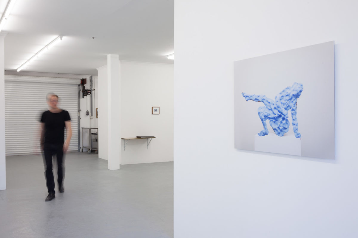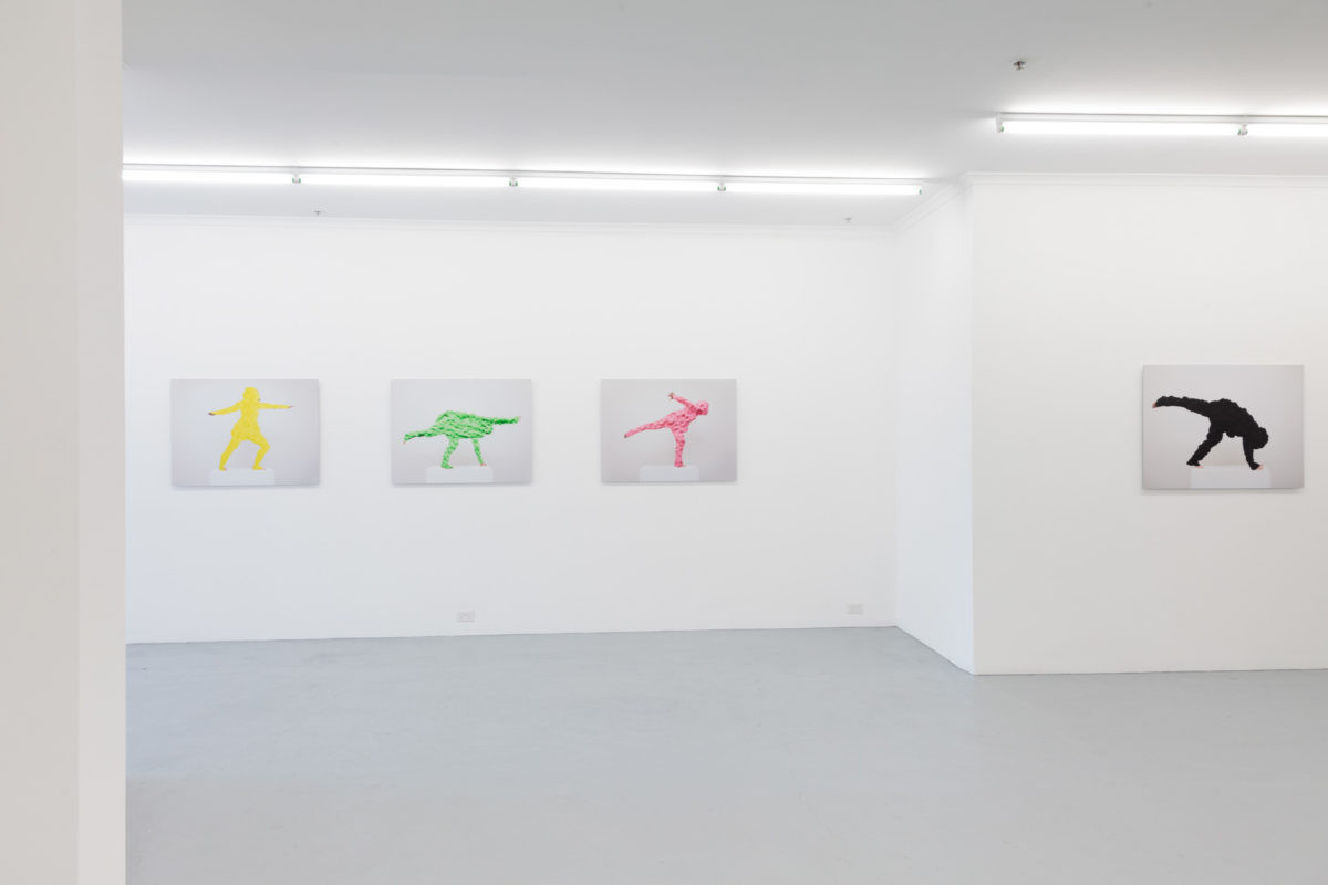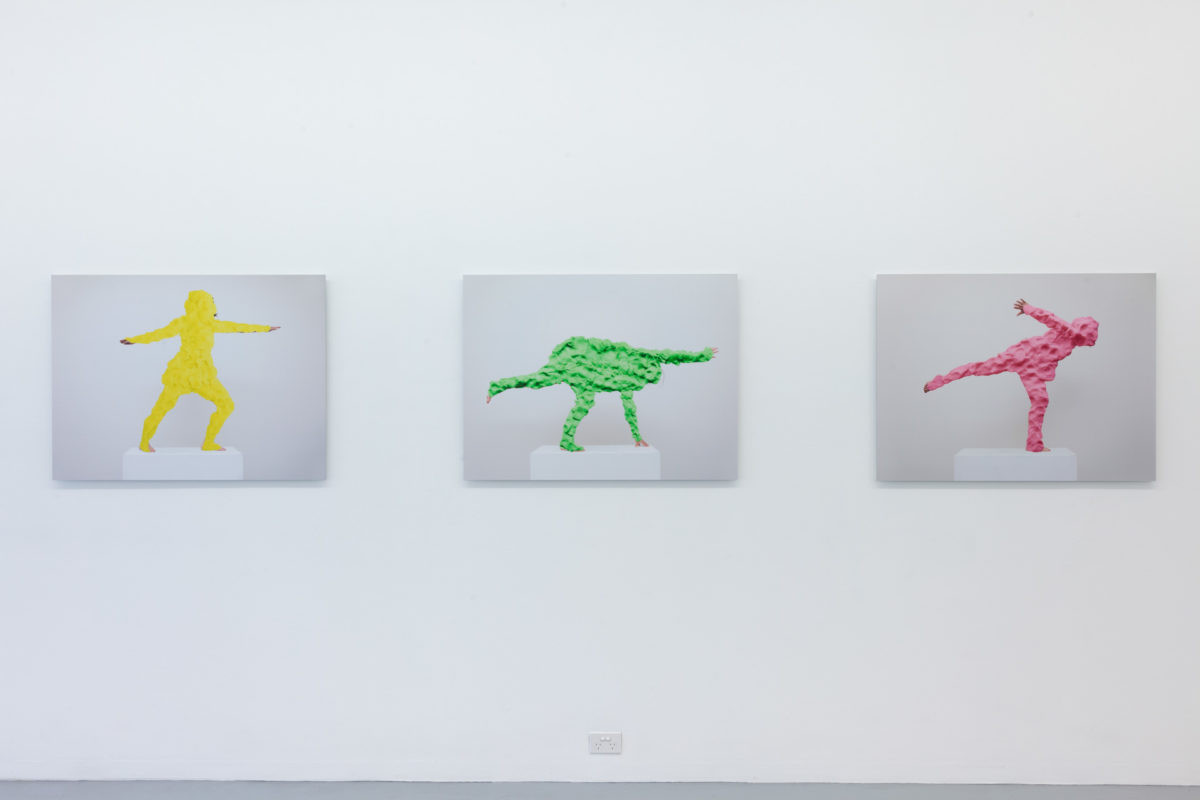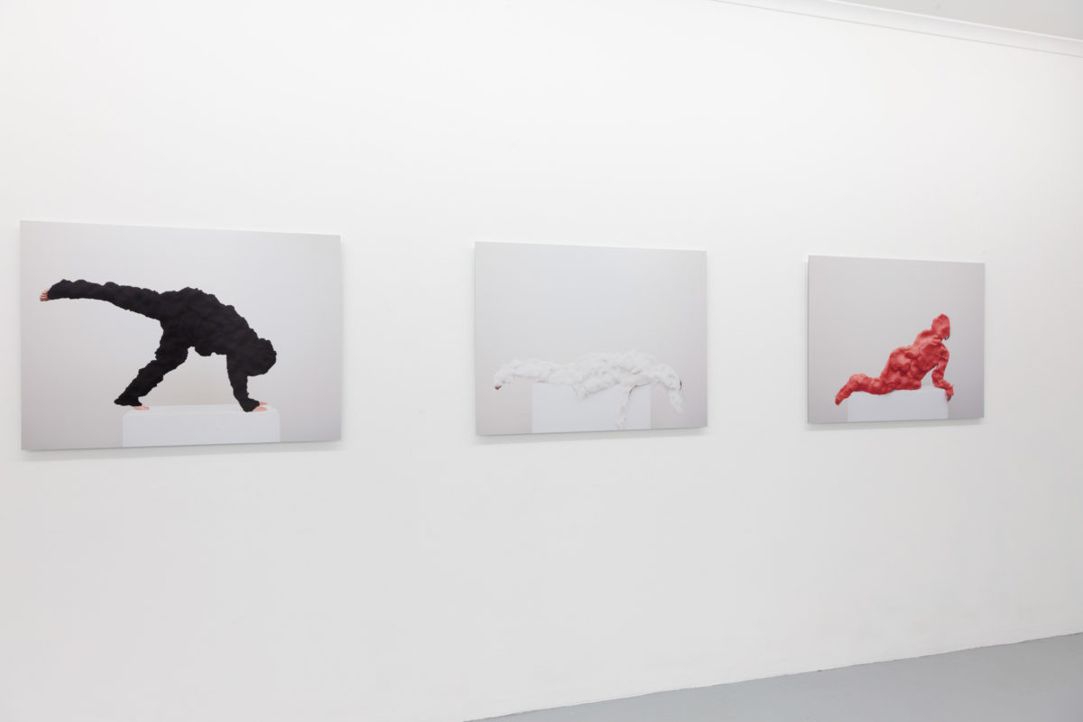 Plinth Piece (2014) charts a similar path by documenting studies of figurative sculptures. They recall Eleanor Antin’s Carving a Traditional Sculpture (1972), where Antin stood before the camera to perform herself as sculpture. By documenting her body front, back and side over several weeks she recorded her ensuing weight loss as a means of ‘sculpting’ the body. Inspired by this work, I have adopted a rather different method. Using photomontage techniques along with brightly coloured children’s play dough I have created a façade to reimagine the body as overwhelming flesh. Plinth Piece reverses Antin’s efforts of shrinking the body through weight loss by instead creating another layer – a body encrusted and simulated.
