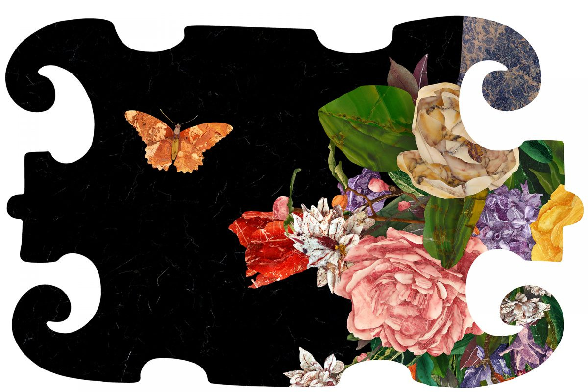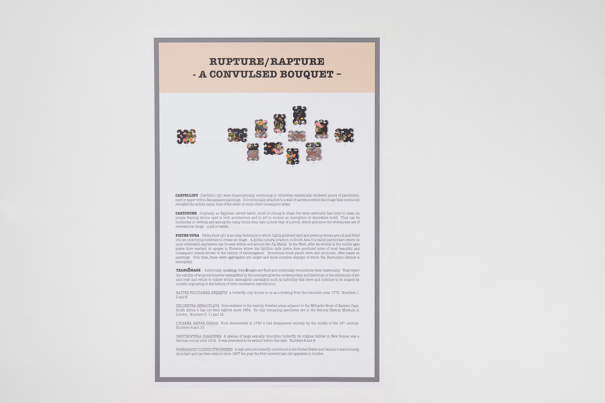 Central to this is a large exploded still life in which concerns around biological diversity are linked to the collapse of cultural plurality and the emergence of pervasive monocultures. In this new series of shaped Pietre Dure sublimation prints stone textures the artist has harvested from the sites of cultural and economic power around the world are used to image butterflies that have become extinct during the epoch of the global art museum. Pietre Dure is an archaic inlay technique in which pictures are created using pieces of polished stone and this will be the artist’s first large scale presentation of these new works.