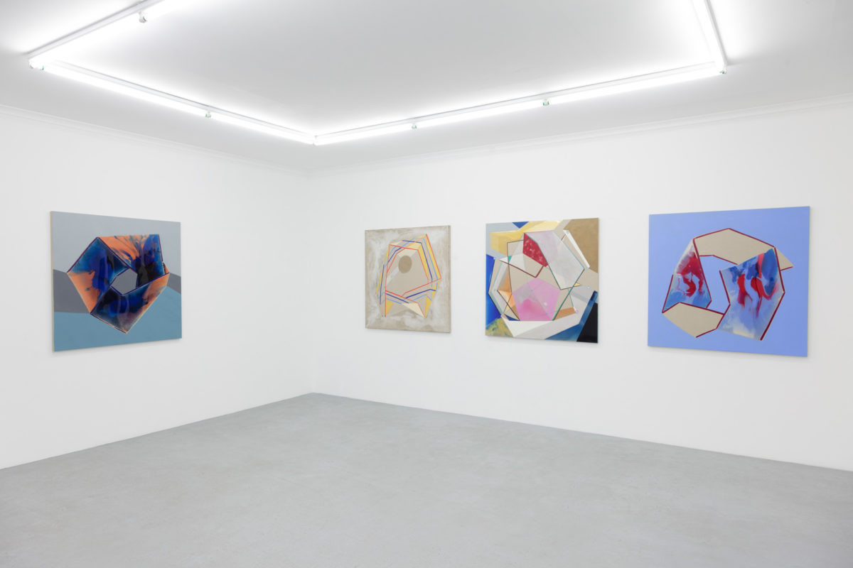 Discussing the task of the dancer, Manning and Massumi describe it as ‘making visible what can only be felt’. Haley’s paintings can be read through the same ambition. How does one visualise an event that can only be experienced? How to embed plurality into a singular image? How does one paint that? An answer can be found in the struggle toward a speculative approach that abstains from fixing movement, in order to remain agile enough for alterity. In this way the Lemniscate Constructions are more about process then representation.