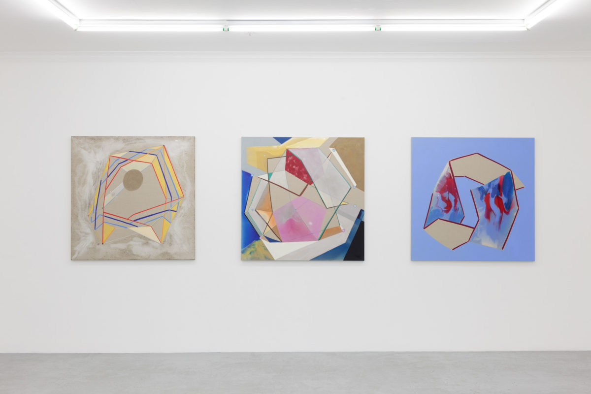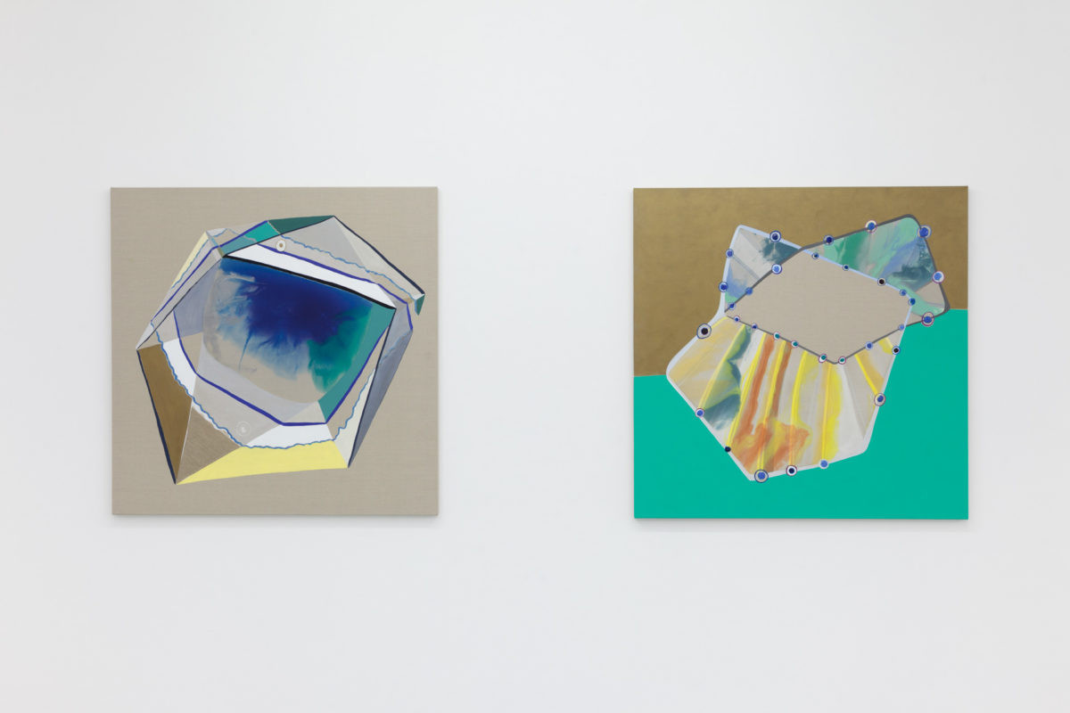 The use of resin adds something spontaneous to the image, a substance unbidden or unconstrained, unwilling to fully comply with the analytical logic of the artist. It coats the canvas in a thick and glossy surface allowing for sharp edges but within which the internal colour bleeds and moves. Textural changes between matt and shiny provoke the viewer to move, to duck and to side step, enticing one closer and pushing one back. In this way we find ourselves moving with the painting, struggling to comprehend but in the process enacting ourselves a kind of movement sequence.