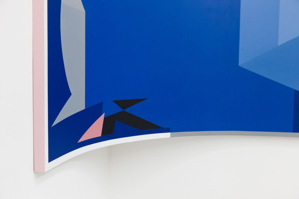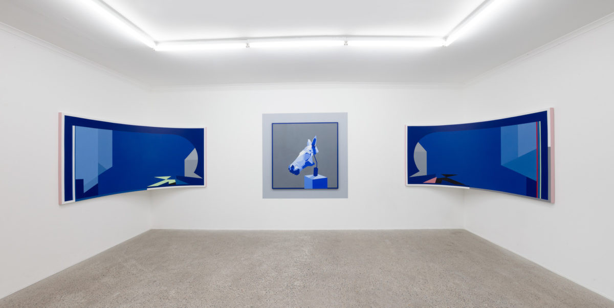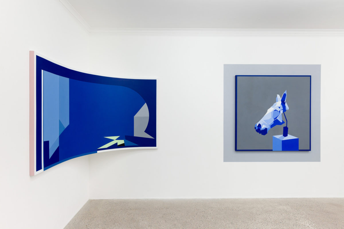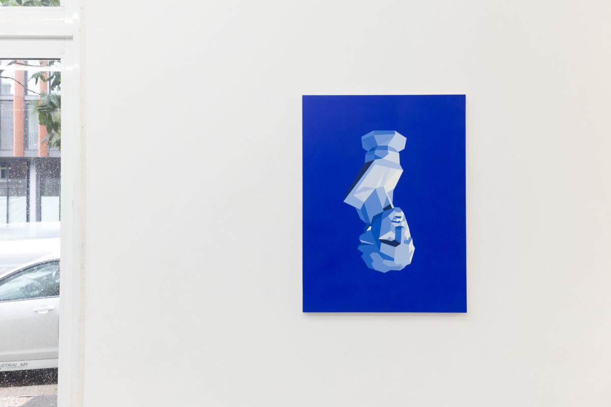 Faced with the digital abstraction of contemporary society, Reynolds responds with the abstraction of objects and space in an exploration of the impact contemporary technologies have had on painting. The mythos of classical art and architecture anchors her image making; contrasting the weight of historic objects against efficient, reproducible technologies and the pleasure-seeking immediacy of the post-internet generation. Alongside geometric and architectural compositions, abstractions of artefacts are framed as objects of new idolisation. Refreshed and disembodied in paint, they simultaneously crave and mock a slower, simpler Platonic era. In its entirety, the exhibition laments our loss of physical experience, and the triumph of the jpeg, but there is excitement in the stillness, too – what is next to come?